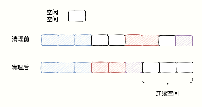 对于 Redis 来说,当一块连续的内存空间被划分为好几块不连续的空间的时候,操作系统先把数据以依次挪动拼接在一块,并释放原来数据占据的空间,形成一块连续空闲内存空间。。