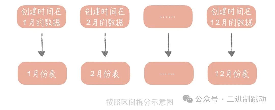 另一种常用的水平拆分方式是基于某个字段的区间进行拆分,通常选择时间字段来划分。例如,在内容表中有“创建时间”字段,我们常常需要根据时间查看某人发布的内容,可能是昨天的内容,也可能是一个月前的内容。