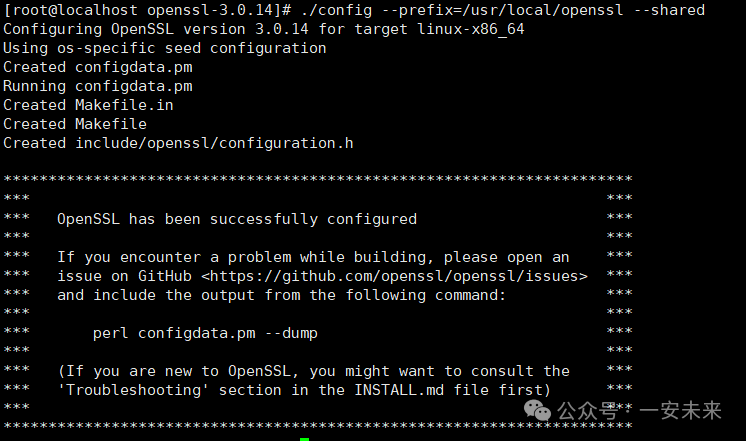 复制tar -zxvf openssl-3.0.14.tar.gz # 解压安装包 mkdir -p /usr/local/openssl # 创建安装目录1.2.编译: