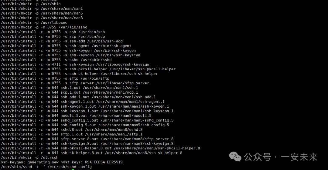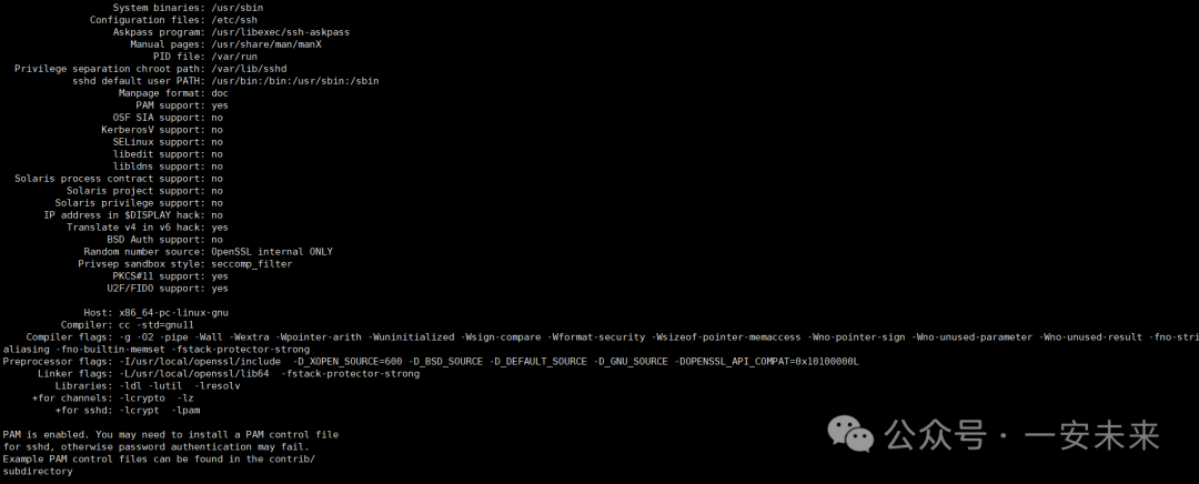 复制tar -zxvf openssh-9.7p1.tar.gz cd openssh-9.7p1 # 使用默认安装目录的openssl ./configure --prefix=/usr --syscnotallow=/etc/ssh --with-md5-passwords --with-pam --with-privsep-path=/var/lib/sshd --without-hardening # 使用指定安装目录的openssl(使用这个) ./configure --prefix=/usr --syscnotallow=/etc/ssh --with-md5-passwords --with-pam --with-tcp-wrappers --with-ssl-dir=/usr/local/openssl --with-privsep-path=/var/lib/sshd --without-hardening # 使用指定安装目录的openssl和zlib ./configure --prefix=/usr --syscnotallow=/etc/ssh --with-md5-passwords --with-pam --with-tcp-wrappers --with-ssl-dir=/usr/local/openssl --with-zlib=/usr/local/zlib --with-privsep-path=/var/lib/sshd --without-hardening # 编译安装 make && make install1.2.3.4.5.6.7.8.9.10.11.12.13.14.