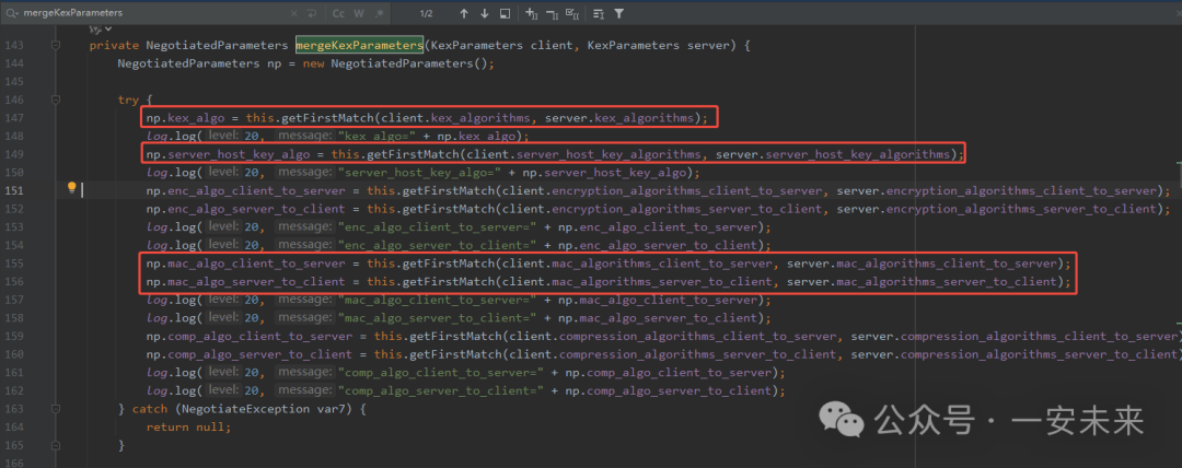 复制java.io.IOException: There was a problem while connecting to 172.18.2.76:22 at ch.ethz.ssh2.Connection.connect(Connection.java:699) at ch.ethz.ssh2.Connection.connect(Connection.java:490) at org.example.ssh.SSH2Util.openConnection(SSH2Util.java:30) at org.example.ssh.SSH2Util.main(SSH2Util.java:221) Caused by: java.io.IOException: Key exchange was not finished, connection is closed. at ch.ethz.ssh2.transport.KexManager.getOrWaitForConnectionInfo(KexManager.java:91) at ch.ethz.ssh2.transport.TransportManager.getConnectionInfo(TransportManager.java:229) at ch.ethz.ssh2.Connection.connect(Connection.java:655) ... 3 more Caused by: java.io.IOException: Cannot negotiate, proposals do not match. at ch.ethz.ssh2.transport.KexManager.handleMessage(KexManager.java:412) at ch.ethz.ssh2.transport.TransportManager.receiveLoop(TransportManager.java:753) at ch.ethz.ssh2.transport.TransportManager$1.run(TransportManager.java:468) at java.lang.Thread.run(Thread.java:748)1.2.3.4.5.6.7.8.9.10.11.12.13.14.15.通过报错信息可知,问题出在密钥交换阶段,客户端和服务端的提议不匹配。找到ch.ethz.ssh2.transport.KexManager类,其中有个方法mergeKexParameters,这个就是匹配服务端客户端两边相关参数通用的算法,底层调用getFirstMatch去比较二者相同的算法。