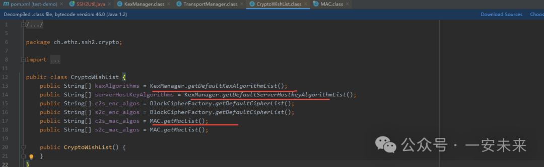在ch.ethz.ssh2.crypto.CryptoWishlist类中查看默认支持的算法,如KexAlgorithms、HostKeyAlgorithms、MACs等参数的值。发现默认算法列表可能与升级后的OpenSSH和OpenSSL不兼容。