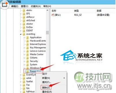4.找到HKEY_LOCAL_MACHINESYSTEMCurrentControlSetserviceseventlog,确认是否存在Parameters项,假如存在,请右键点击该项并点击“导出”作为备份,假如删除该项后发生其他问题,可以双击该文件导入注册表作为备份。然后将eventlog下的Parameters文件夹右键删除。
