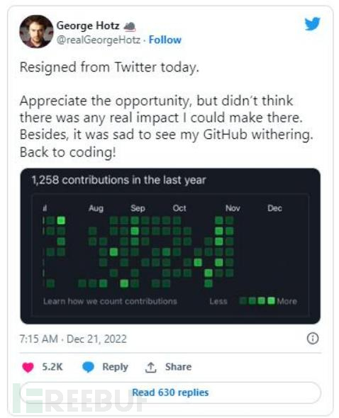 George 入职 Twitter 不足6 周George 于 10 月份辞去自动驾驶初创公司 Comma AI 首席执行官职位,不久后便在社交媒体表示支持现Twitter 首席执行官埃隆-马斯克的言论——公司需要“非常硬核”、“需要改革”,并展现出加入 Twitter的兴趣。