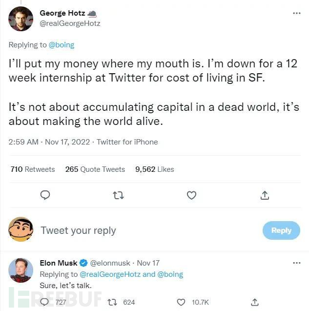 在看到 George 呼吁后,马斯克这边是“郎有情、妾有意”,迅速在 twitter 上表示可以一起谈谈。11月16日,香港云服务器媒体爆出了 George 将在旧金山的 Twitter 进行为期 12 周的实习消息。
