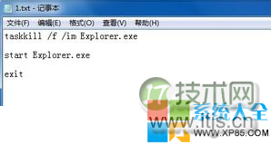 将以上三行代码写入新建TXT文本文件中,将其重命名为“重启explorer.bat”,扩展名为bat,而非txt。双击执行此文件,即可重启资源管理器。
