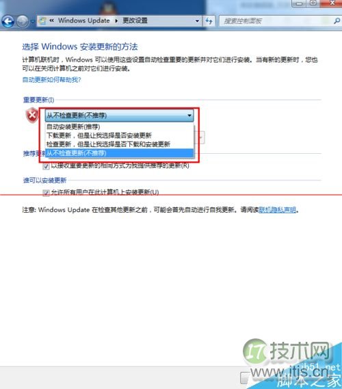 5、关更新更新该办点击【重要更新】选项,网站模板机老选择【从不检查更新】,提示【推荐更新】和【谁可以安装更新】把对钩点击消掉,页面确定