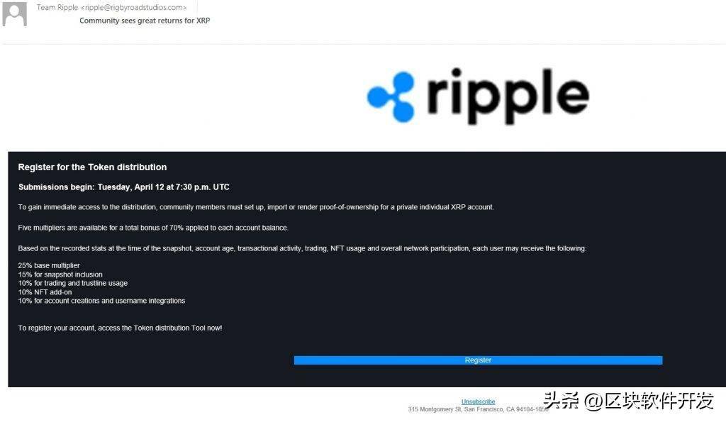这种类型的攻击始于加密电子邮件活动:用户收到一封来自Ripple加密货币交易所的电子邮件,并提供加入XRP代币(该平台的内部加密货币)的赠品。