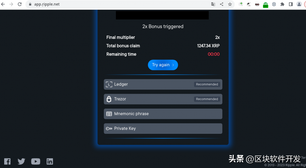 此时,可以看出该骗局已经显示出与攻击热钱包的一些不同之处:攻击者没有向用户发送网络钓鱼页面的链接,而是利用博客开发了一种更复杂的沉浸式技巧。他们甚至一丝不苟地复制了Ripple网站的设计,并注册了一个与该交易所官方域名几乎相同的域名。这被称为Punycode网络钓鱼攻击。乍一看,二级域名与原始域名相同,但仔细观察会发现字母“r”已被使用cedilla的Unicode字符替换: