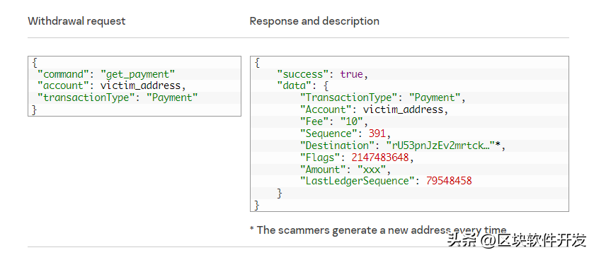 攻击者使用这两个API与受害者的XRP账户进行交互。钓鱼网站API与WebSocket地址对话,验证帐户详细信息并请求资金。为此,攻击者们专门设计了一次性的中间钱包。