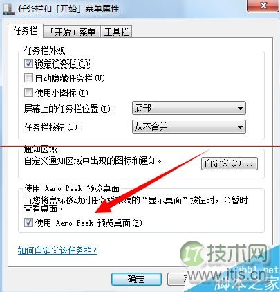2、进入任务栏界面,将【使用Aero peek预览桌面】选项关闭,点击确定