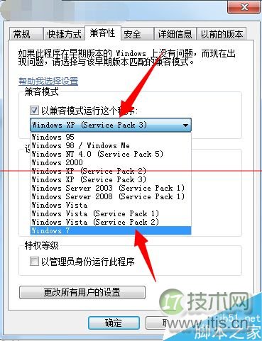 3、进入兼容性设置界面,勾选【使用兼容性运行程序】,然后在下方选项中选择【Windows 7】,点击确定问题解决