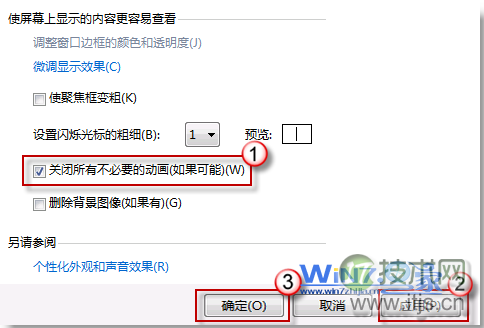 3、亿华云计算接着在下面找到“使屏幕上的不必内容更容易查看”栏目下,勾选“关闭所有不必要的画效动画(假如可能)”,依次点击应用按钮,在点击确定按钮退出即可。