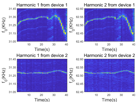 图2展示了来自两台不同设备的四个谐波分量在时间上的中心频率-时间图。可以观察到,来自同一设备的谐波频率变化趋势有一定的关联性,而不同设备的频率变化具有明显的差异。网站模板因此,内存电磁辐射谐波的中心频率波动趋势(频漂)可以用于设备识别和评估环境中的内存EMR信号数量。通过将测得的频谱变化与已知设备的特定的内存EMR频漂指纹匹配,即便在复杂的环境中也可以将内存电磁辐射分量隔离出来,进行下一步分析。
