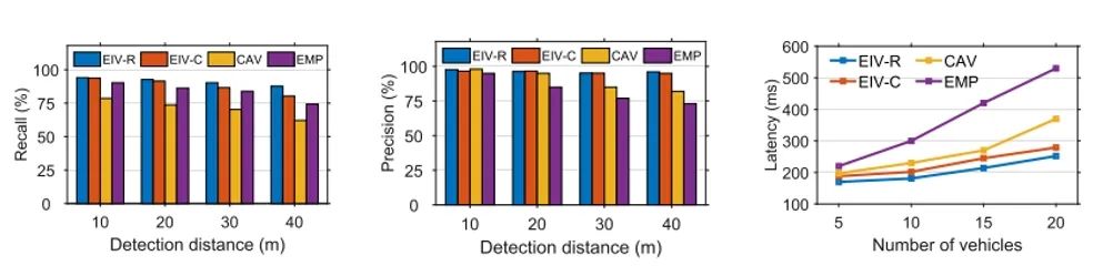 CAV:当前的CAV实现主要利用网络链接来访问高清地图数据、实时天气、交通更新和后端计算功能。它代表了单个自动驾驶车辆的基线感知能力。我们进一步比较边缘辅助多车辆感知系统(EMP)。EMP:指的是本文提出的边缘辅助多车辆感知系统。它利用附近多辆车辆共享的传感器数据,并在边缘将它们合并以增强感知。结果如下列图所示,在回归率、精度和延迟上EIV都有着非常不错的性能: