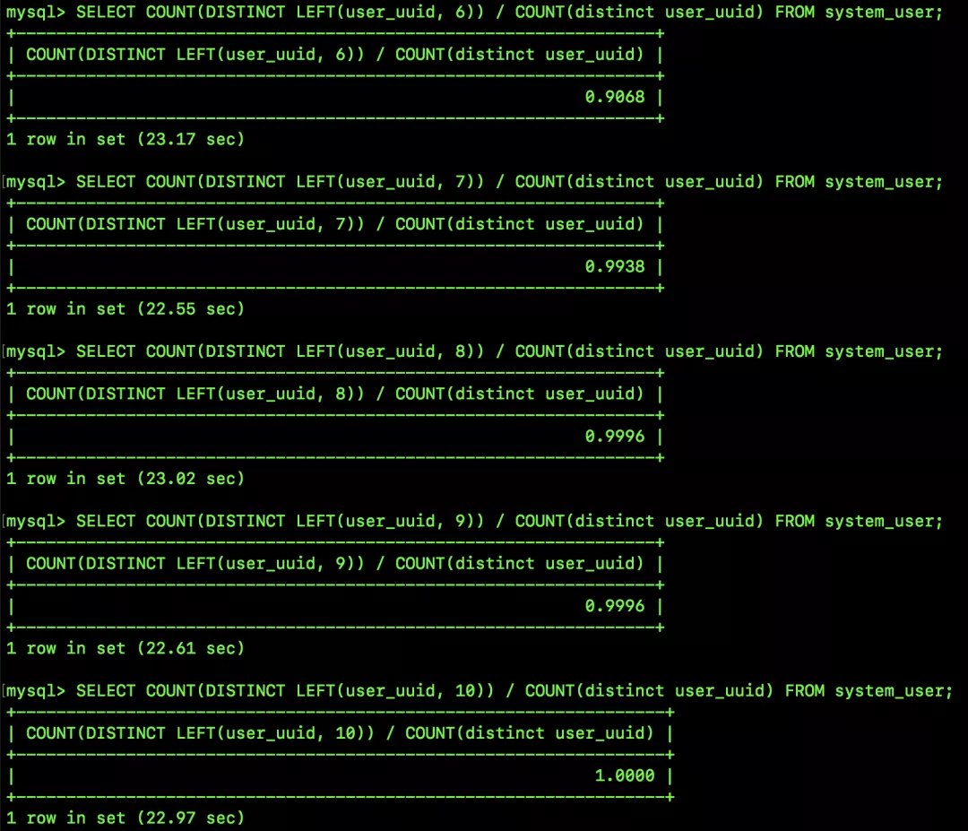 8 和 9 的选择性是一样的,因为在 uuid 字符串中,第 9 个字符串是 -,所有的 uuid 第九个字符串都一样,所以 8 个字符和 9 个字符串的区分度就一样。