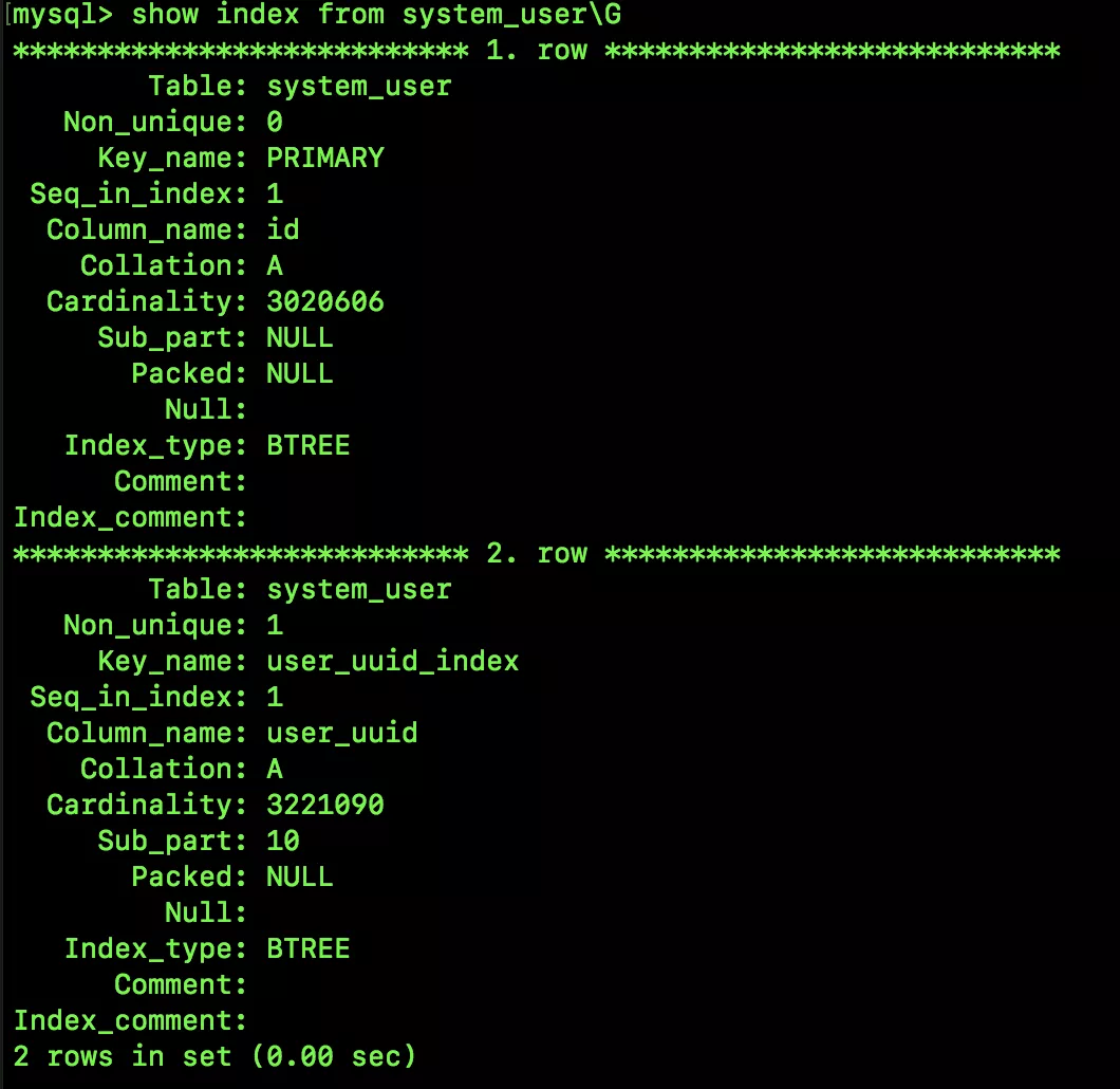 首先我们通过如下 SQL 来看一下 user_uuid 全列索引选择性是多少: