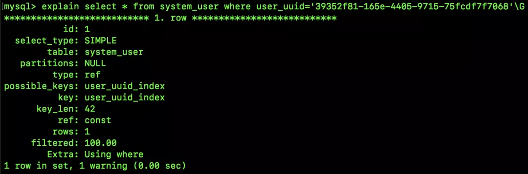 复制select user_uuid from system_user where user_uuid=39352f81-165e-4405-9715-75fcdf7f7068;1.这次不是 select *,而是 select user_uuid,按照松哥之前的文章(是时候检查一下使用索引的姿势是否正确了!),大家知道,这里应该是要用到覆盖索引,我们来看看执行计划: