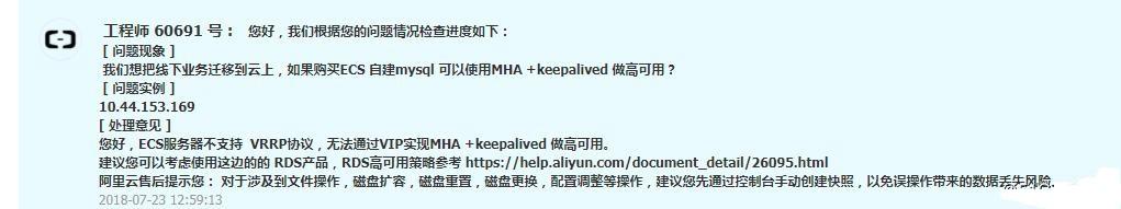 阿里云工单反馈截图
