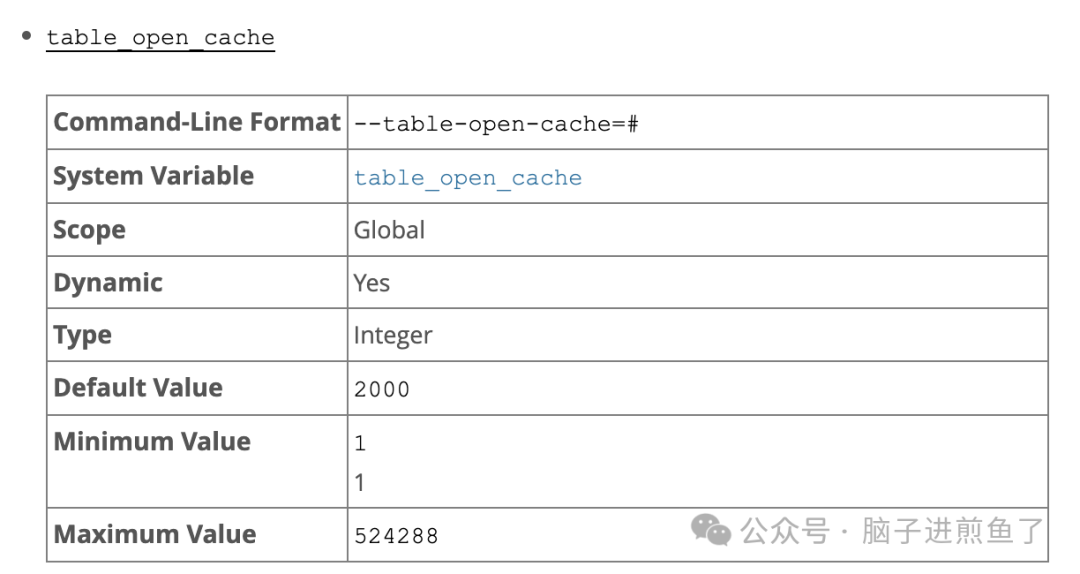 3、classTable__cache 缓存查询性能下降:当 table_open_cache 本身使用的是哈希表作为数据结构,以此实现查询。如果 table_open_cache 设置的过于大,也意味着查询性能的下降(与数值合理的情况下对比)。