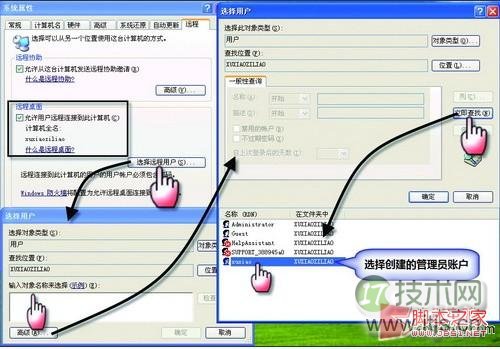 然后切换到“远程选项”,选择“远程桌面”下的“允许用户远程连接到此计算机”,然后单击“选择远程用户”按钮出现对话框,单击“高级”在单击“立即查找”按钮选择创建的管理员账户,再连续单击“确定”按钮即可。