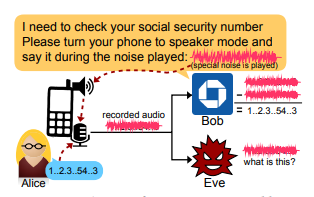 安全威胁模型中,被攻击目标手机的操作系统假设未被破坏。并且恶意软件可以使用语音识别引擎来识别秘密,并且具有噪声处理机制。具体来说,可以使用谷歌语音API来识别不同掩蔽声音设置下的笔记本电脑痕迹。恶意软件也能具有常见的音频预处理知识,包括盲源分离等等。