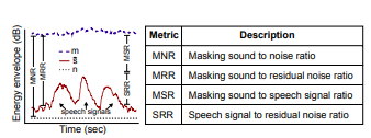 四个指标尽可能高时可以实现最佳性能。但高SRR意味着低MSR。SNR与播放掩蔽声音的音量呈负相关。因此,掩蔽声足够大(MNR高)才能降低秘密信息的噪声比。但掩蔽声的音量不可能无限放大,而且掩蔽声过大时,线性通道响应的假设会无效。