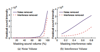 用SIC去除信号的一个常见问题:使用过高的音量来播放掩蔽干扰会增加其与SIC去除的残余误差。首先去除的信号(即掩蔽噪声)比随后去除的信号(即掩蔽干扰)具有更大的信号强度时,实验发现系统达到最佳性能。而且掩蔽干扰的能量比总是固定在比掩蔽噪声的音量低10dB,这可能是基于实验的假设:秘密语音的能量比要低掩蔽声13DB。