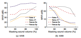 实验选用Note 4,Nexus 5X、Nexus 6P和Sony Z1执行了测试,6P的效果在最大音量时最好,这可能是由于麦克风和扬声器的动态范围不同导致的。实验也发现,掩蔽声的音量不能设置过大,因为播放全音量的掩蔽声会导致非线性失真和麦克风饱和。
