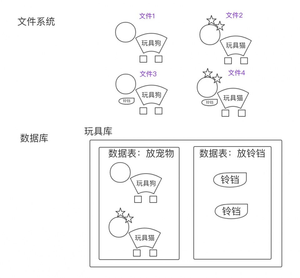 文件系统 vs 数据库 文件系统和数据库的主要区别是?简单举个例子,如上图所示。我们理解的数据和文件比较接近,例如文件1存放了玩具狗的网站模板数据,文件2存放了系铃铛的狗的数据。但其实玩具狗、玩具猫都是玩具,铃铛和玩具是可以拆分的。数据库的结构化(玩具库架子),让数据不会重复,玩具狗可以系铃铛,也可以不系。 关系型数据库