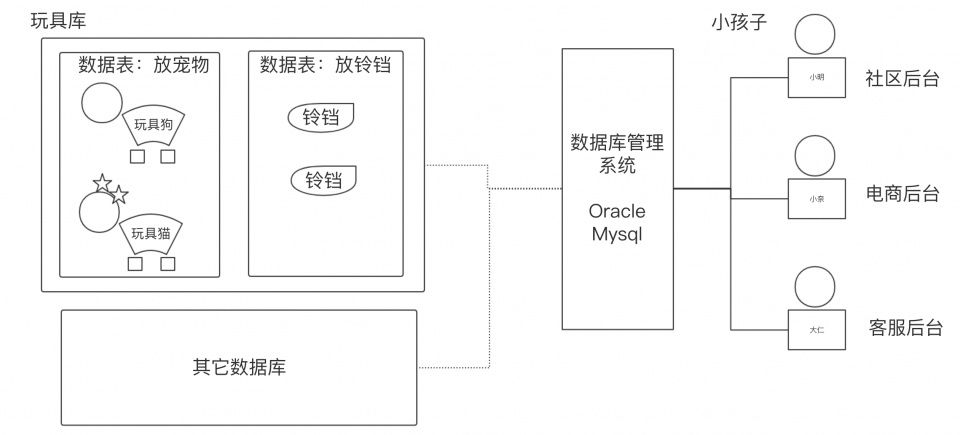 结构化、共享访问的数据库的除了是结构化存储、它还可以共享给程序访问。文件系统时候,程序a读取文件1(小明的玩具),数据库时代,所有程序只要有权限就可以访问所有数据库里的数据(大家的玩具共享)。