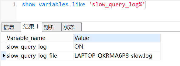 查看下慢查询日志配置,我们可以使用show variables like slow_query_log%命令,如下: