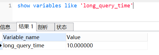 我们还可以使用show variables like long_query_time命令,查看超过多少时间,才记录到慢查询日志,如下: