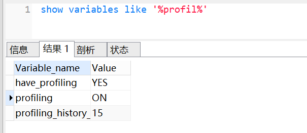 profiling默认是关闭,我们可以使用show variables like %profil%查看是否开启,如下: