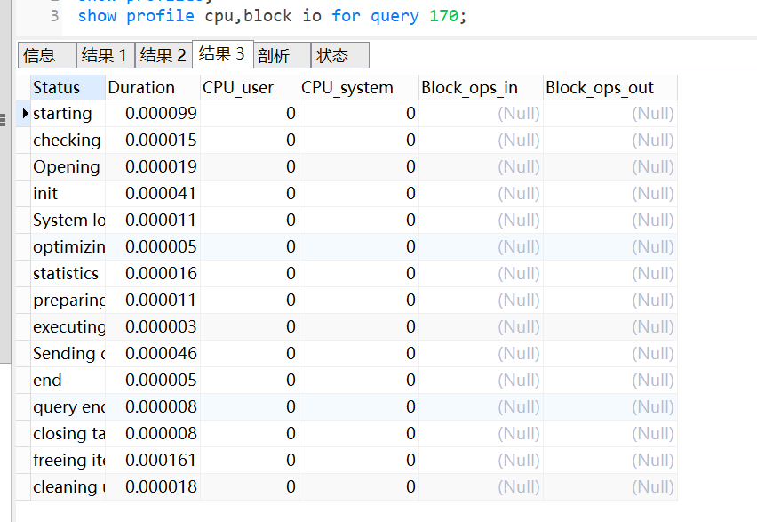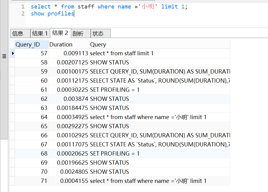 show profiles会显示最近发给服务器的多条语句,条数由变量profiling_history_size定义,默认是15。如果我们需要看单独某条SQL的分析,可以show profile查看最近一条SQL的分析。也可以使用show profile for query id(其中id就是show profiles中的QUERY_ID)查看具体一条的SQL语句分析。
