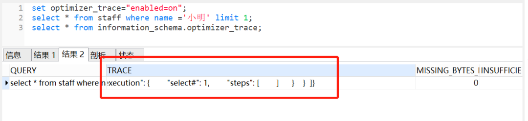 我们可以使用set optimizer_trace="enabled=on"打开开关,接着执行要跟踪的SQL,最后执行select * from information_schema.optimizer_trace跟踪,如下: